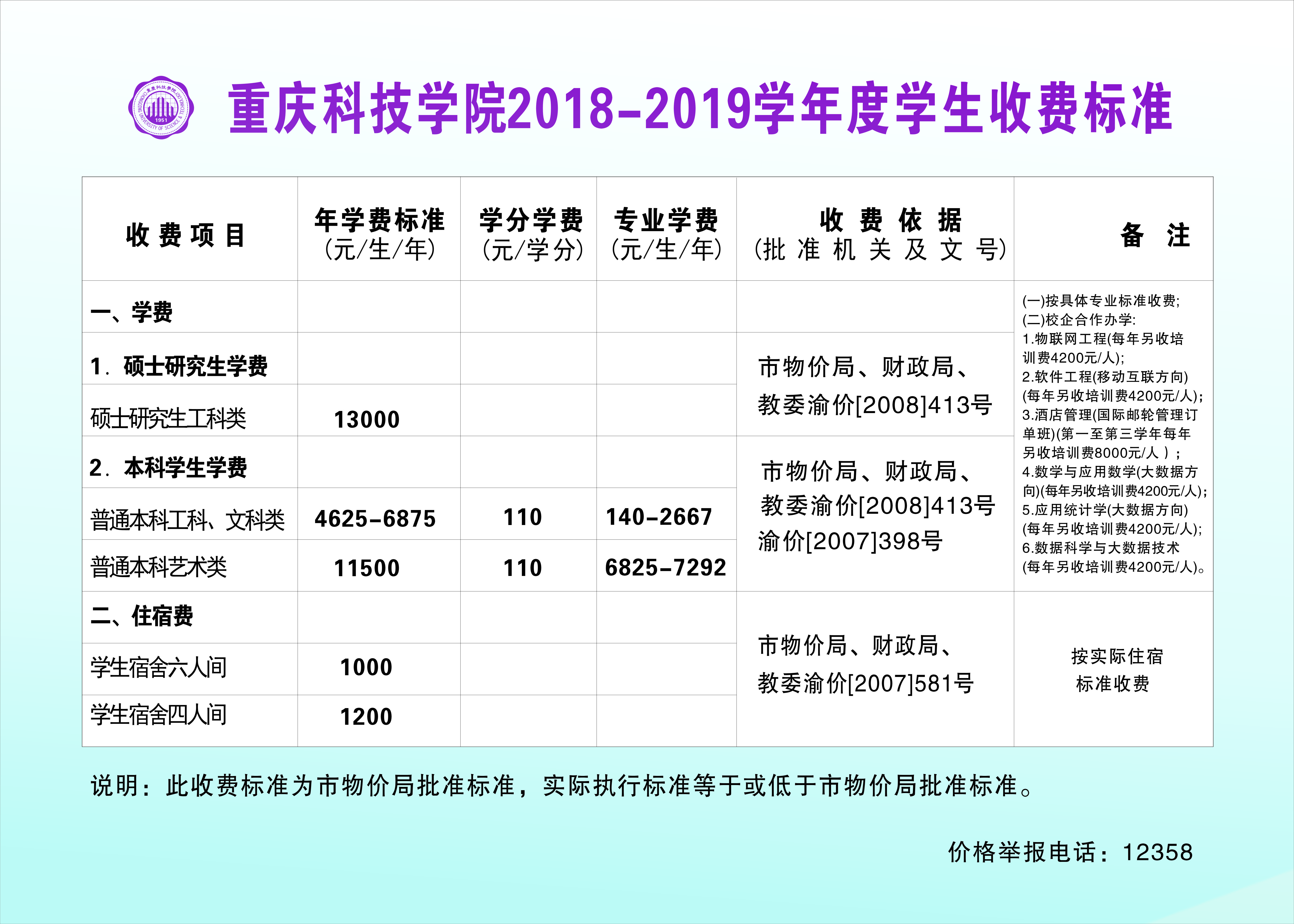 重庆科技学院2018-2019学年度学生收费标准